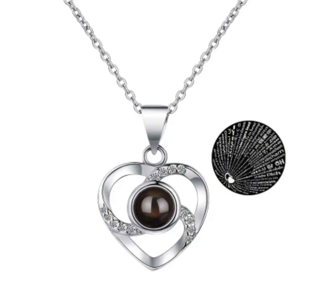 Heart Zirconia “I Love You” In 100 Languages Photo Projection Necklace – FREE Slide-Out Jewelry Box Included