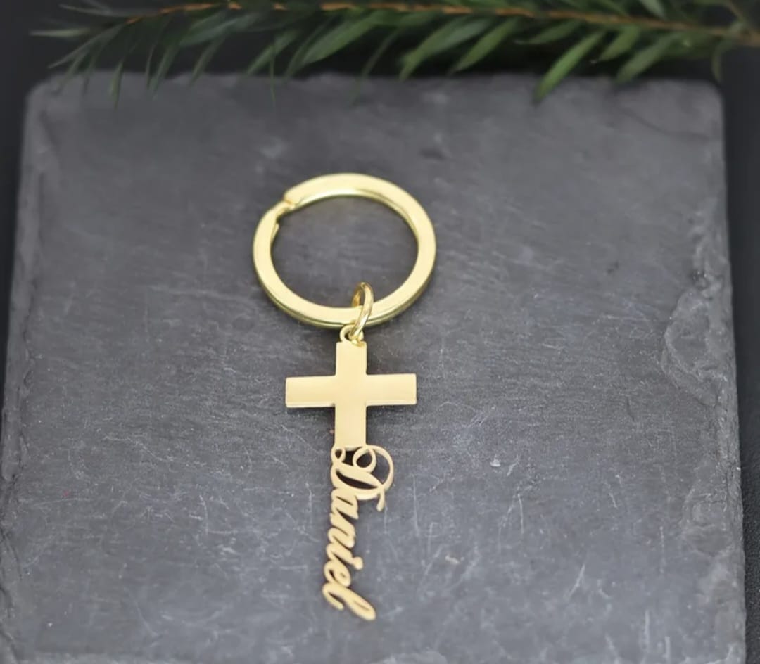 Personalised Cross Name Keyring; Stainless Steel
