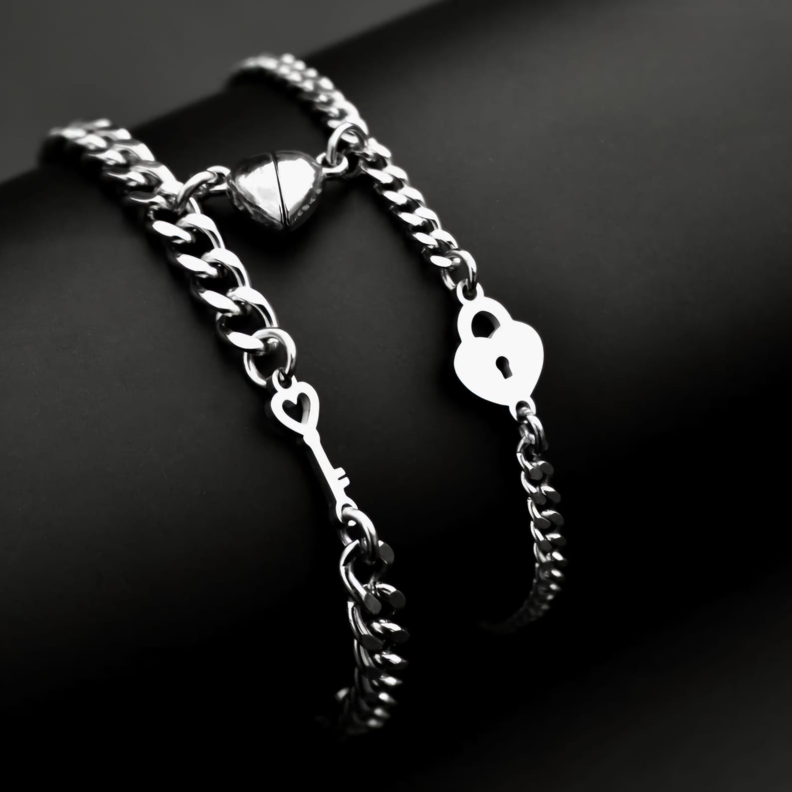 Valentines Special – Lock and Key 2 Piece Couples Magnetic Heart Bracelets – FREE Slide-Out Jewelry Box Included